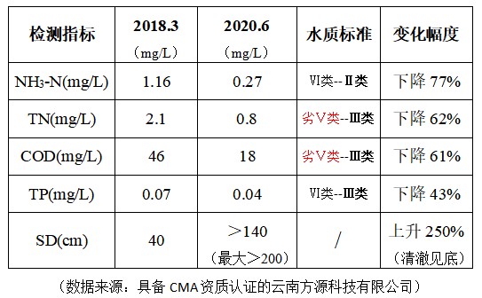经2018年5月至2020年5月两年的治理及维护,水生态系统健康稳定发展。示范区内水质提升至III类水并维持稳定达1年以上,“新型光催化技术”利用科技与自然共力,短期内改善水质指标,中长期生态恢复自愈自洁,真正实现清水稳态。洱源西湖项目无论是水质还是水生态都达到并超过设定的目标和考核指标。