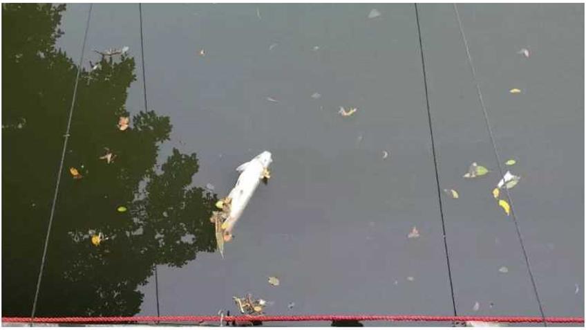 治理前塘内水体浑浊,水面脏乱,排口处漂浮死鱼;经检测,水中溶解氧仅0.8mg/L,透明度仅16cm,属于劣V类水。lX2新型光催化网_水库治理_河道治理_水生态修复_水环境治理与修复_江苏双良环境科技有限公司