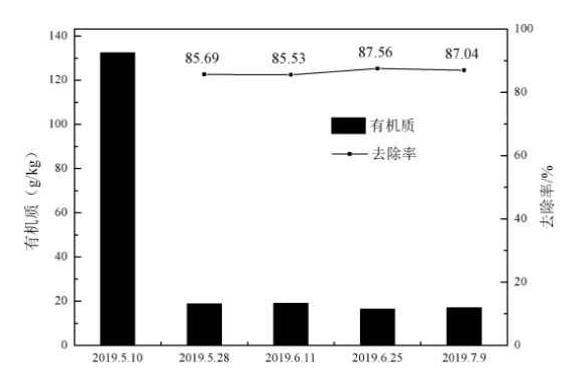 由图可以看出经过治理后,底泥中有机质的含量大幅度减少,到2019年7月9日,平均去除率达到87.04%。lX2新型光催化网_水库治理_河道治理_水生态修复_水环境治理与修复_江苏双良环境科技有限公司
